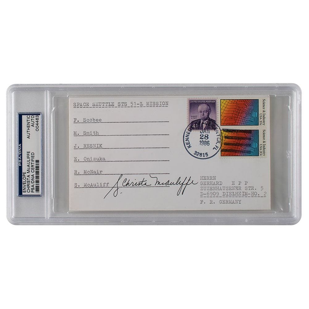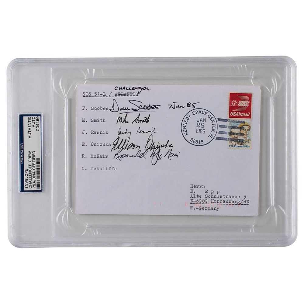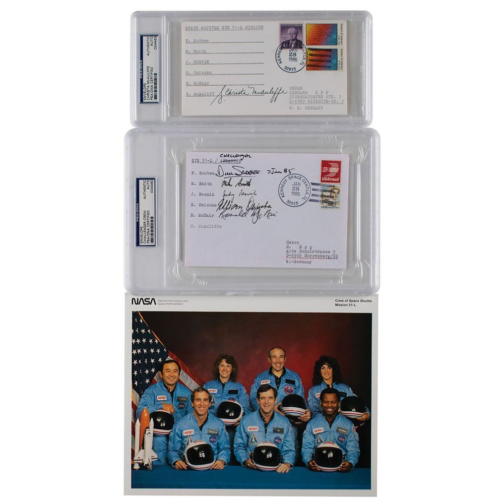 Two STS-51-L launch day covers, both postmarked at Kennedy Space Center on January 28, 1986, with one signed in black felt tip by S. Christa McAuliffe, and the other signed by the remaining members of the crew: Dick Scobee, Mike Smith, Judy Resnik, Ellison Onizuka, and Ron McNair. Scobee also strikes through the erroneously typed "Atlantis," writing "Challenger" instead, and dates his signature, "7 Jan 85." In overall fine condition. Both are encapsulated in PSA/DNA authentication holders. Accompanied by an unsigned official NASA lithograph of the crew.