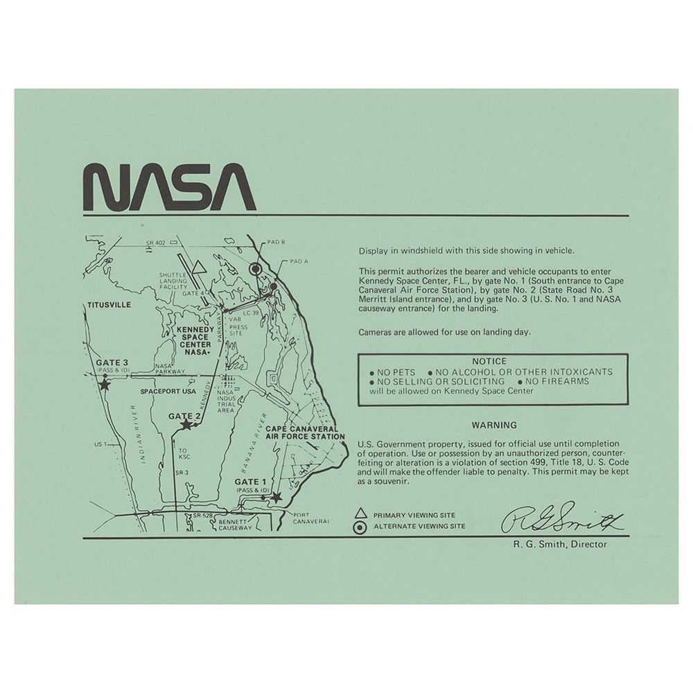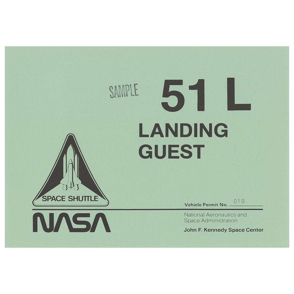 Original NASA 11 x 8.5 vehicle permit for the launch of the ill-fated STS-51-L mission at Kennedy Space Center Launch Complex 39B on January 28, 1986, issued as No. 10, with permit marked "Landing, Guest" and stamped "Sample." In fine condition.