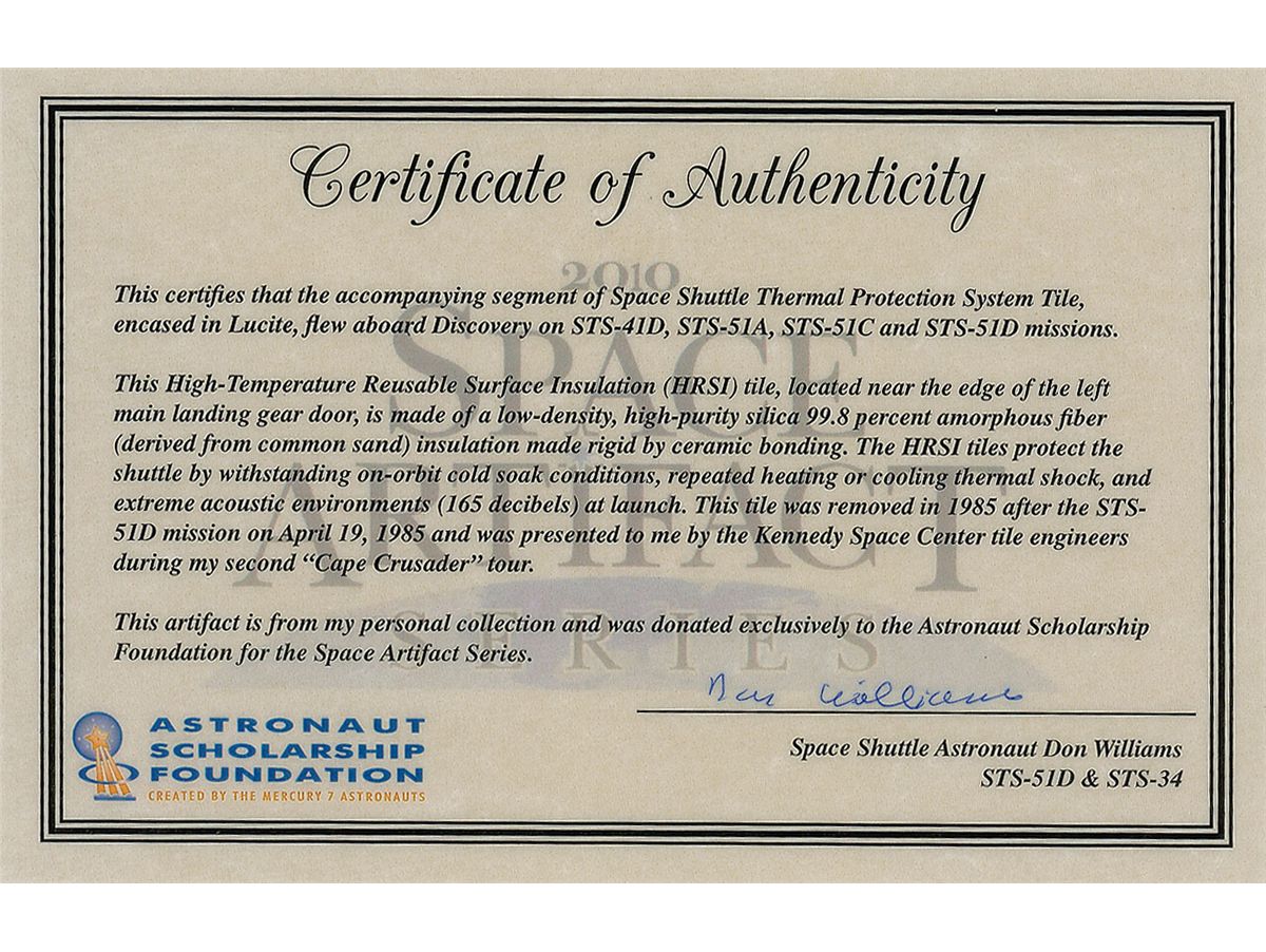 Flown Thermal Protection System (TPS) tile segment flown aboard the shuttle Discovery’s STS-51D mission, approximately .5 x .5. Encased in a cylindrical 2.75 x 3.25 piece of Lucite cut at an angle for display purposes, with a mission emblem and certificate of authenticity at the bottom. This limited edition piece was originally distributed through the Astronaut Scholarship Foundation. In fine condition. Accompanied by a matching certificate of authenticity signed by astronaut Don Williams certifying that it is a piece from his personal collection.