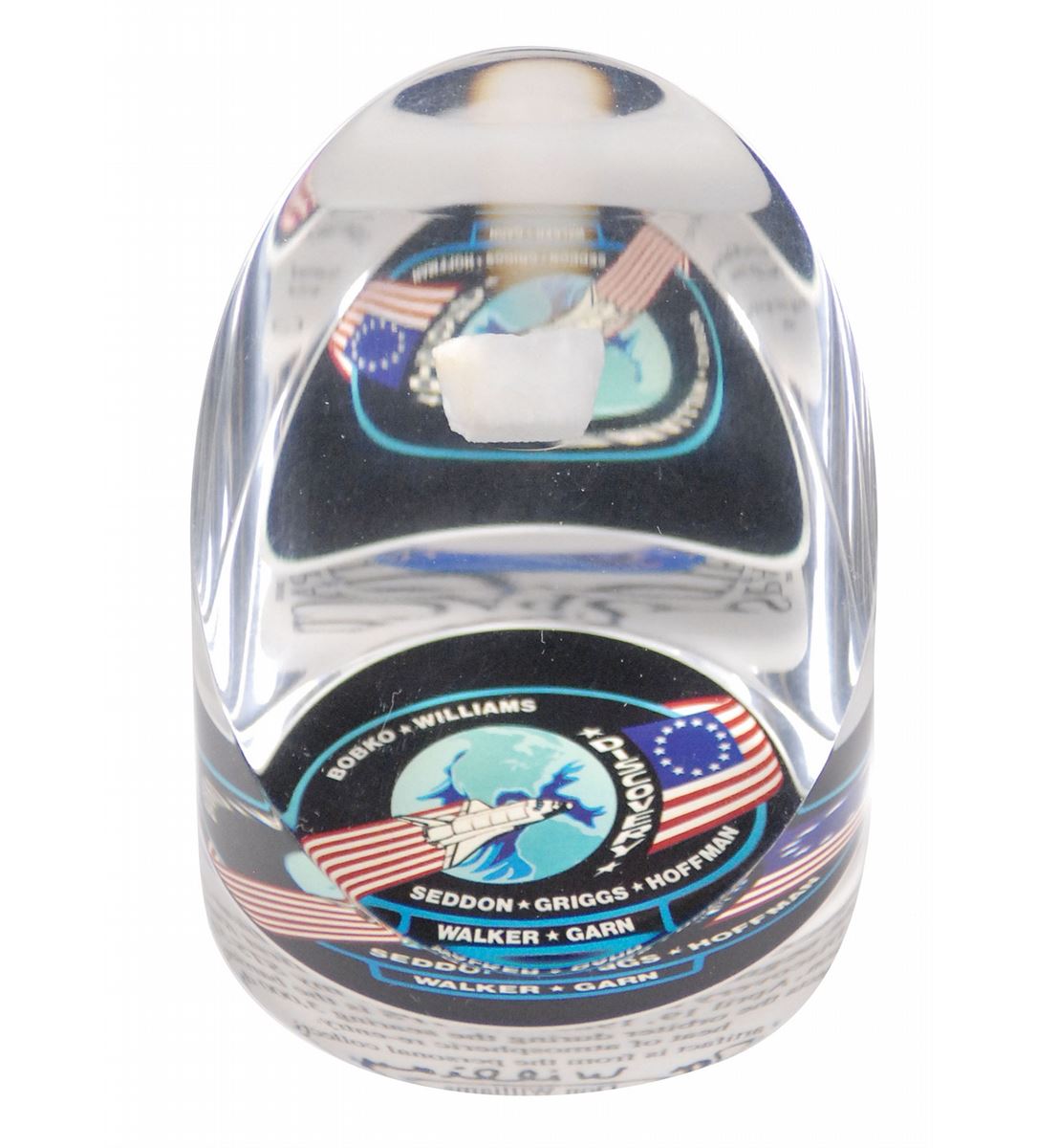 Flown Thermal Protection System (TPS) tile segment flown aboard the shuttle Discovery’s STS-51D mission, approximately .5 x .5. Encased in a cylindrical 2.75 x 3.25 piece of Lucite cut at an angle for display purposes, with a mission emblem and certificate of authenticity at the bottom. This limited edition piece was originally distributed through the Astronaut Scholarship Foundation. In fine condition. Accompanied by a matching certificate of authenticity signed by astronaut Don Williams certifying that it is a piece from his personal collection.
