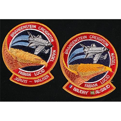 <Our item number 137855><B>STS-51D/51G, 1985, Crew Patches.</B> The original crew of STS-51D (Brandenstein, Creighton, Lucid, Nagel, Fabian, Jarvis and Walker) were reshuffled, once STS-51D was cancelled. All but Jarvis and Walker were reassigned to STS-51G and Baudry and Al-Saud were added as their replacements. The same orange, red and blue crew patch was used as was issued for STS-51D, with a tab for the added crew members. Less than 100 of the original crew patches were believed distributed before the mission was cancelled. Both cancelled and re-issued patches are included in this lot along with matching decals. The original patch and decal are almost impossible to locate today. Both are in excellent condition. <BR>Estimated Value $150 - 250. <BR><BR>Our item number 137855<BR><IMAGES><P ALIGN="CENTER"><IMG SRC="http://www.goldbergcoins.net/liveauction/49jpegs/137855.jpg"> </P></IMAGES>