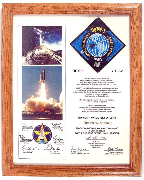 STS-52, FLOWN, "USMP-1" Mission Patch (3.5") mounted on a multicolor presentation certificate (framed to 12.5x15.5") that reads, in part: "This emblem, representing the first United States Microgravity Payload (USMP-1) was flown aboard the Space Shuttle Columbia during Mission STS-52 launched on October 22, 1992". Only 200 of these patches were flown. A copy of a NASA letter detailing the numbers of Mission Patches and Mission Flags is enclosed. Striking and attractive.