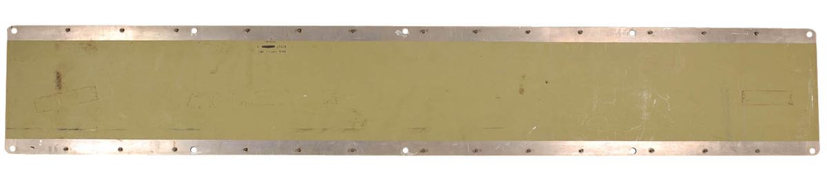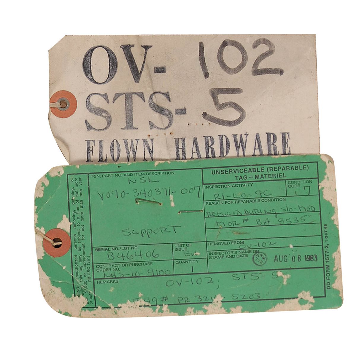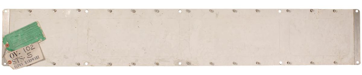 Flown white support panel, flown on board the space shuttle Columbia during STS-5, launched on November 11, 1982. Panel measures 55.5 x 9, and retains all 26 screws. Two tags are tied to one edge, one reads, “OV–102, STS-5 Flown Hardware,” and the other is an “Unserviceable (Repairable) Tag–Material,” filled out in an employee’s hand, identifying the part as “support,” its mission, and reason for condition, “Removed during Slo–Mod.” In very good condition, with expected wear and soiling from use.