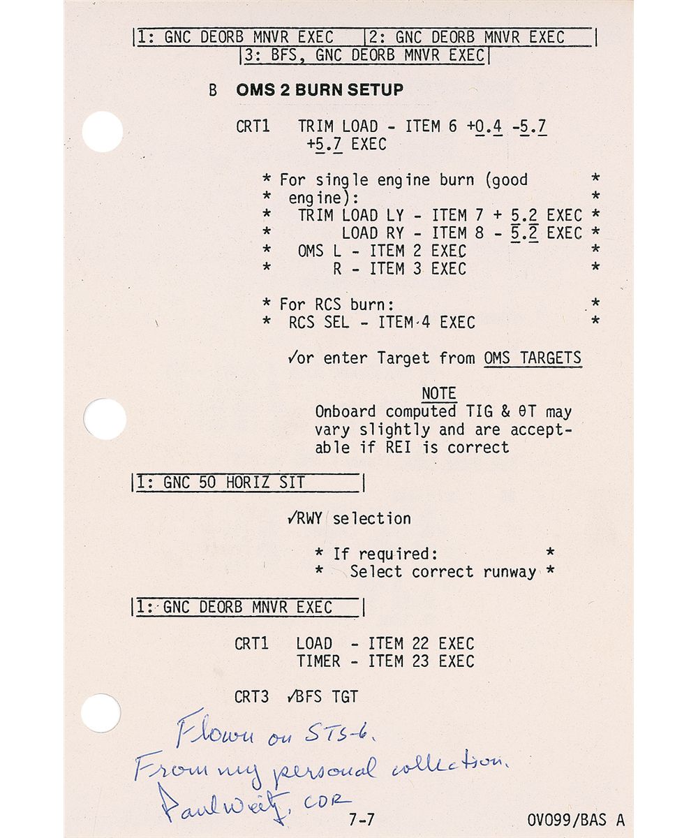 Flown two-sided checklist page carried on board STS-6, 5.5 x 8, identified as pages 7-7 and 7-8, signed at the bottom in blue ballpoint, “Flown on STS-6, From my personal collection, Paul Weitz, CDR.” In very fine condition.