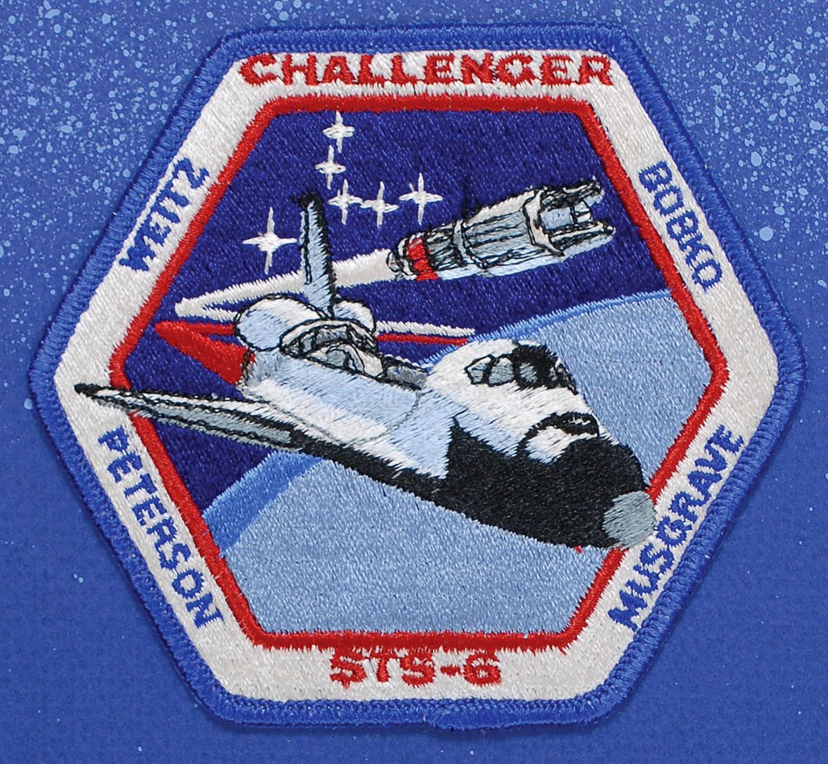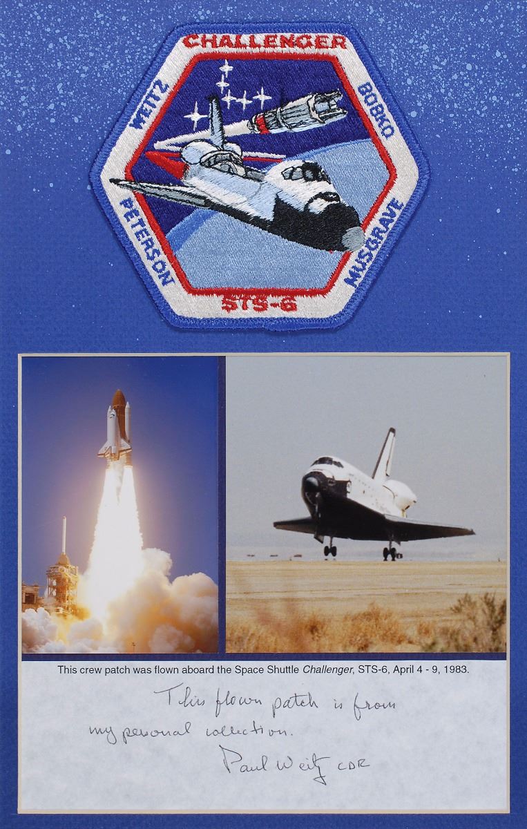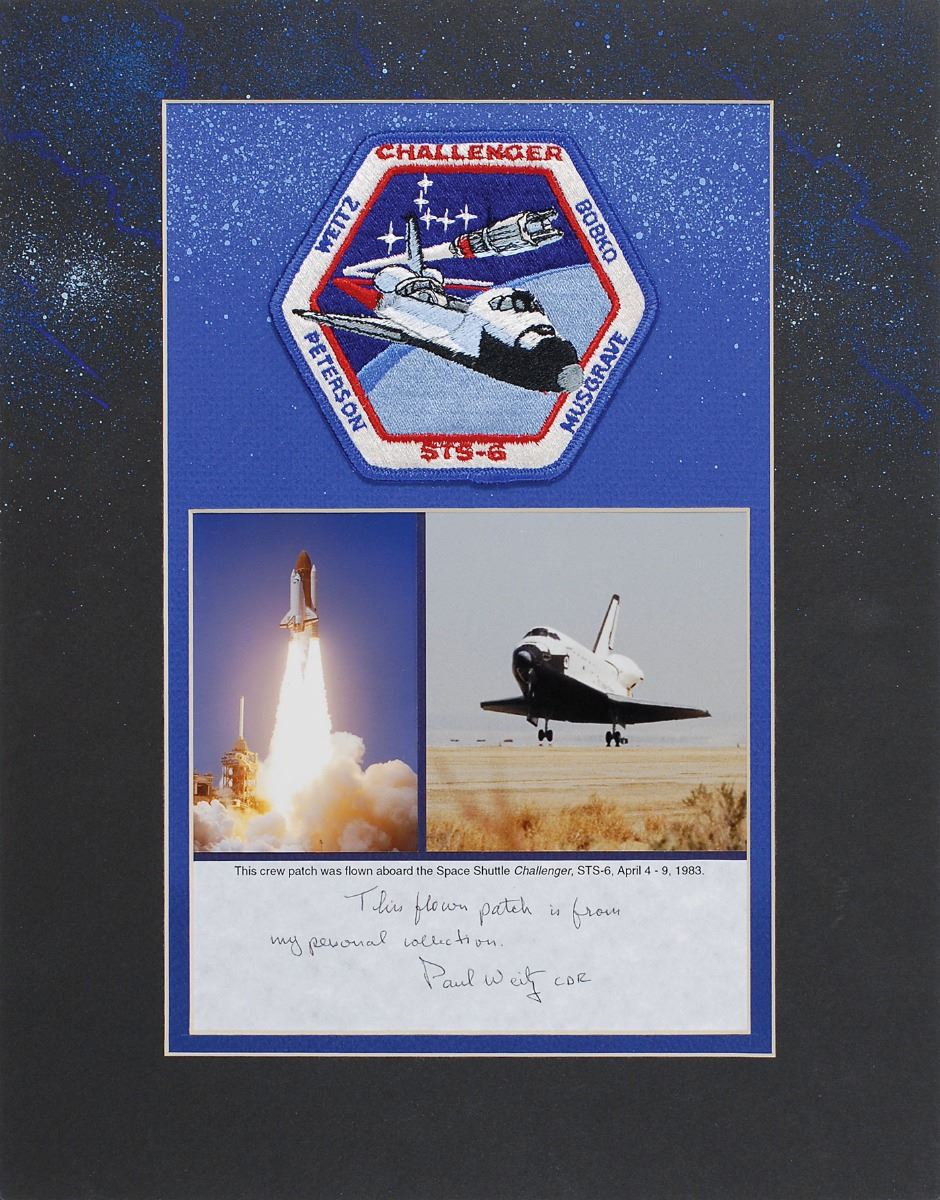 Flown embroidered STS-6 mission patch, 4.5? in diameter, affixed at the top of a matted 11 x 14 display with two images of the shuttle, signed at the bottom in black ballpoint, “This flown patch is from my personal collection, Paul Weitz CDR.” A typed caption above Weitz’s certification also reads: “This crew patch was flown aboard the Space Shuttle Challenger, STS-6, April 4–9, 1983.” In fine condition. The Leon Ford Collection.