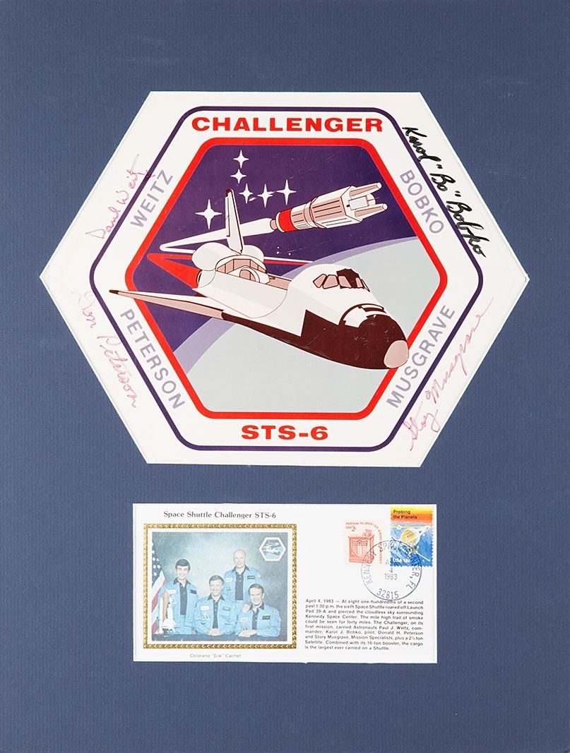 Color glossy 10.25 x 7.75 photo of the STS-6 mission insignia, signed next to their names in black felt tip by Paul Weitz, Karol 'Bo' Bobko, Story Musgrave, and Don Peterson. Matted with a commemorative cover with a silk cachet honoring the STS-6 mission to an overall size of 12 x 16. In fine condition, with a few scratches to the photo.