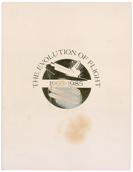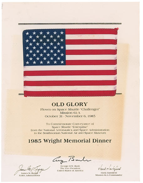 Flight-flown printed fabric American flag, 5.75 x 4, flown aboard the Space Shuttle Challenger in 1985. Flag is accompanied by an 8.5 x 11 presentation folder stating: “Old Glory. Flown on Space Shuttle ‘Challenger’ Mission 61-A, October 31–November 6, 1985. To commemorate conveyance of Space Shuttle ‘Enterprise’ from the National Aeronautics and Space Administration to the Smithsonian National Air and Space Museum, 1985 Wright Memorial Dinner.” The flag is detached from the certificate, which bears the printed signatures of President George Bush and two NASA officials. Areas of heavy staining and two blocks of mild to moderate toning affecting the printed text, otherwise fine condition.
