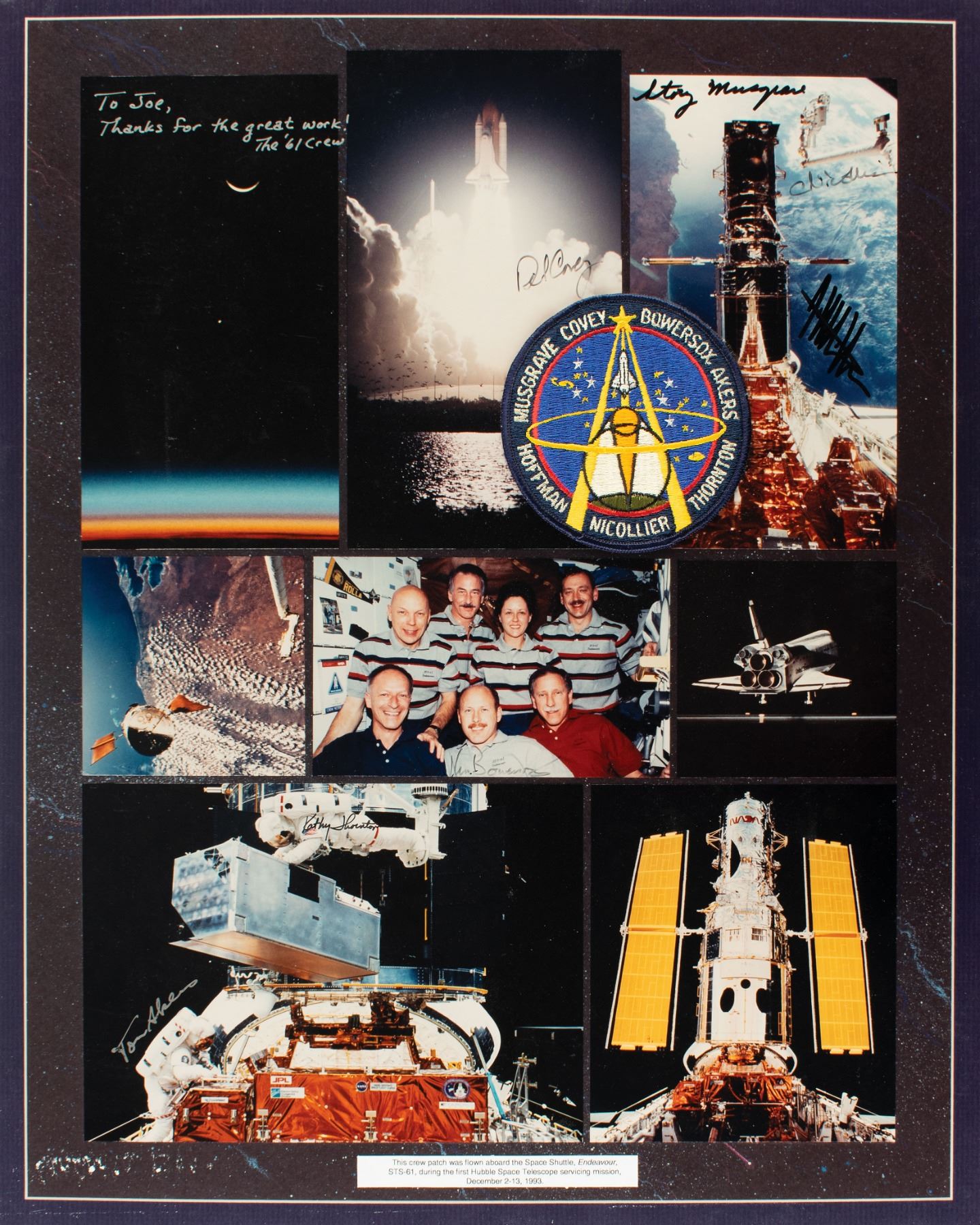 Color glossy 16 x 20 composite photo of the STS-61 crew and various images from their 10-day mission, featuring a flown embroidered mission patch affixed to upper right, with the photo signed in black felt tip by Richard Covey, Story Musgrave, Claude Nicollier, Ken Bowersox, Kathy Thornton, and Jeff Hoffman, and in silver ink by Tom Akers, with an inscription above reading: “To Joe, Thanks for the great work! The ‘61 Crew.” The photo bears an affixed caption in the lower border, which reads: "This crew patch was flown aboard the Space Shuttle, Endeavour, STS-61, during the first Hubble Space Telescope servicing mission, December 2–13, 1993.” Affixed to the original same-size mount. In fine condition. Accompanied by a signed certificate of authenticity from veteran Space Shuttle astronaut Joe Tanner.