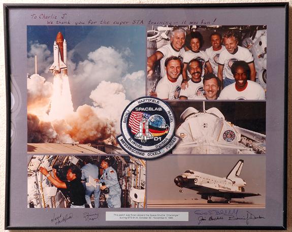 STS-61A, 1985, FLOWN Mission Patch. Mounted on a framed, multicolor presentation board (20x16") that is inscribed at top: "To Charlie J - We thank you for the super STA training - it was fun!" The board is signed at the bottom by crew members Hank Hartsfield, Steve Nagel, Guion Bluford, Jim Buchli and Bonnie Dunbar, on both sides of a descriptive label that reads: "This patch was flown aboard the Space Shuttle "Challender" during STS-61-A, October 30-November 6, 1985". Attractive.