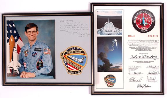 STS-61C, 1986, "Materials Science Lab" Mission Patch (3.5") mounted on a multicolor presentation certificate that reads, in part: "This emblem represents the Materials Science Laboratory (MSL)-2 payload which flew on STS-61C launched January 12, 1986…". ALSO included is a crew patch, framed, along with a photo of Bob Cenker with a handwritten inscripton alongside. An attractive pair. Less than 50 Mission patches were made.