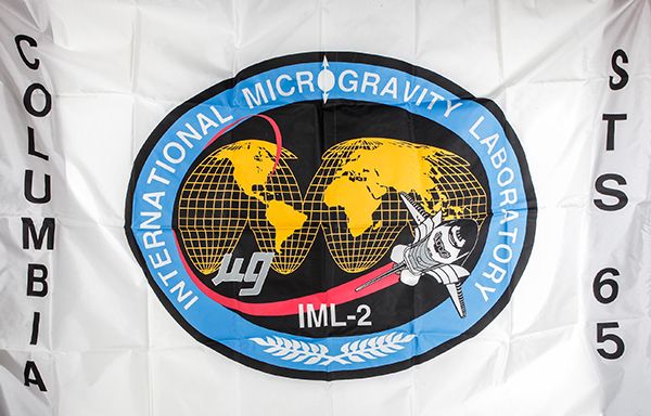 Sts-65 Payload Flag -- Flown At Marshall Space Flight Center During the Mission. The Shuttle Columbia launched on 7/8/94. It carried a crew of 7 and the International Microgravity Laboratory (IML-2). The IML-2 was an international mission to provide the worldwide science community with a variety of complementary facilities and experiments. The experiments all evolved around microgravity and life sciences. This flag was flown during the mission at the Marshall Space Flight Center Payload Operations Control Center in Huntsville, Alabama. This was the site of all IML-2 communication with Mission Control in Houston. This flag was presented to the consignor for his work on the flight. A COA certifying that the flag was flown as described is included.