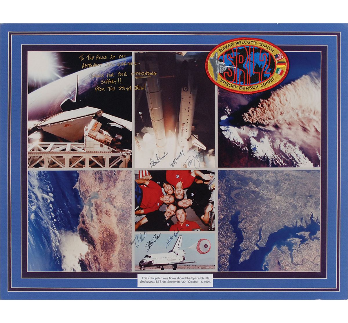 Flown embroidered Shuttle STS-68 mission patch, 4.75? in diameter, carried on board the Endeavour during its September–October 1994 mission. Patch is affixed to a 20 x 16 color glossy composite photo of the shuttle and crew, with a typed caption affixed to the bottom, and inscribed in gold ink in an unknown hand, “To the folks at KSC Astronaut Crew Quarters—Thanks for your outstanding support!! From the STS-68 crew!,” and signed In black felt tip by Michael Baker, Terry Wilcutt, Tom Jones, Steven Smith, Dan Bursch, and Peter Wisoff. In fine condition.