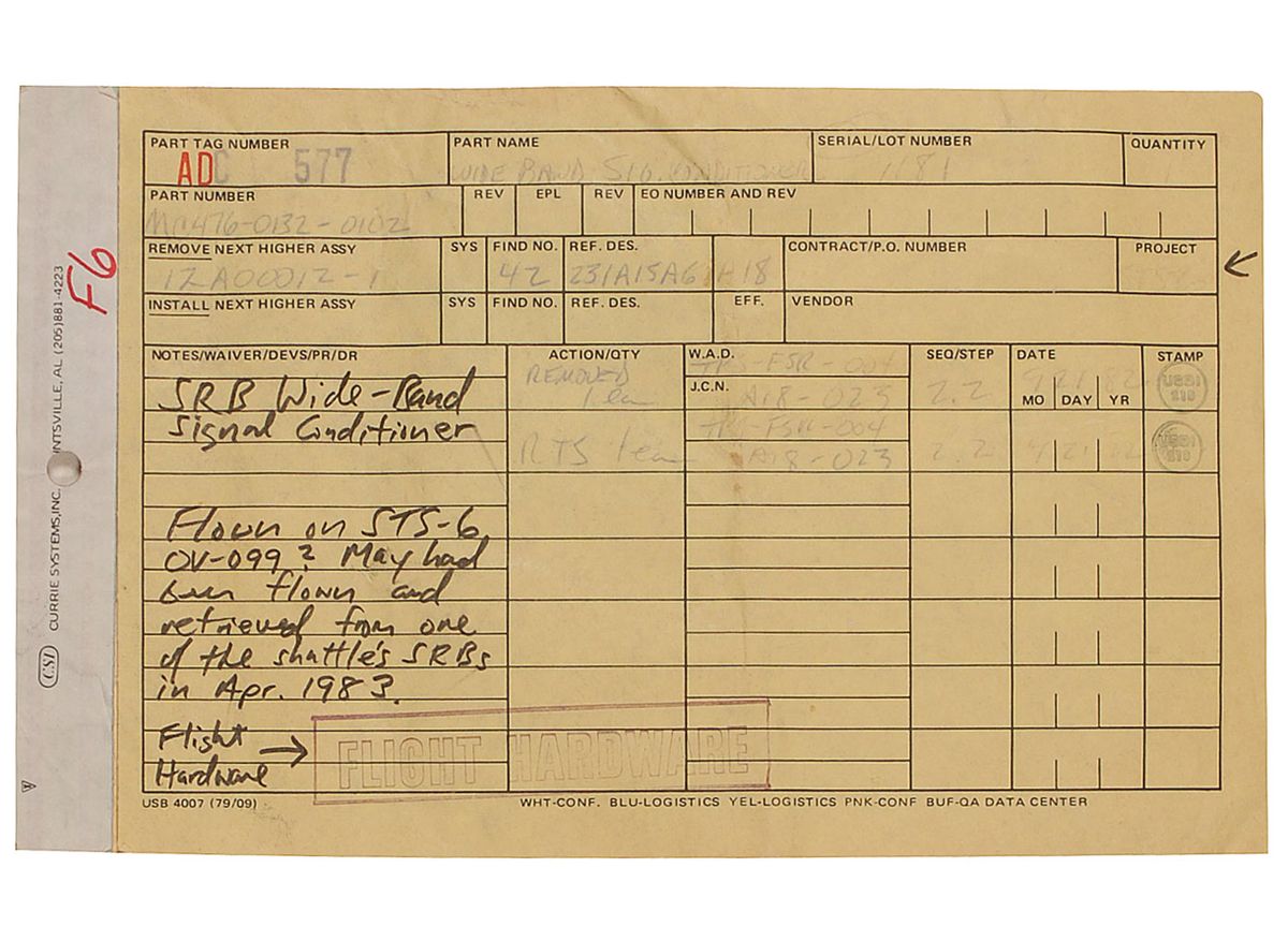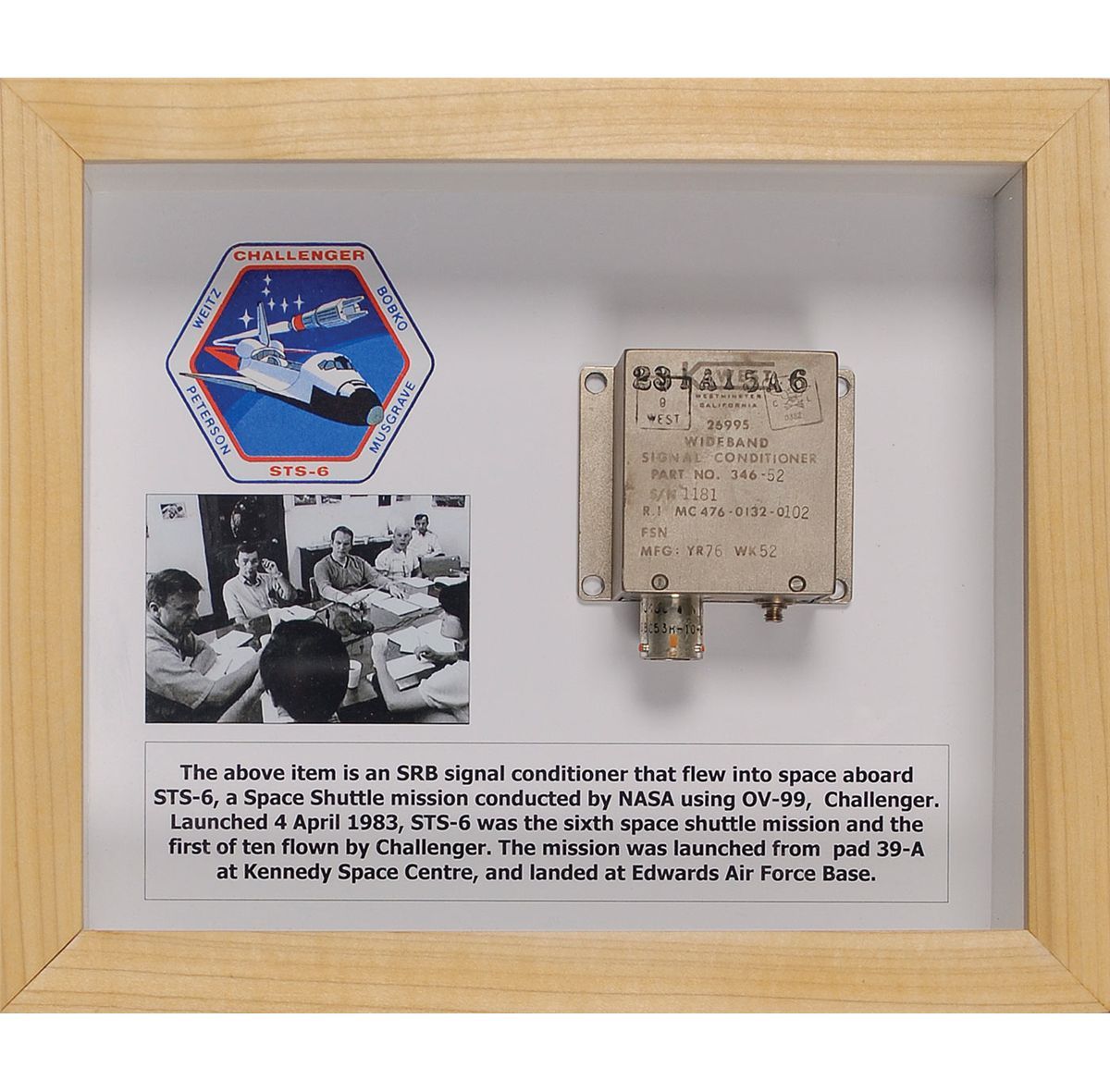 Flown SRB wideband signal conditioner, flown aboard Challenger shuttle mission STS-6. Part is stamped “Wideband Signal Conditioner.” Part is shadowboxed and framed against a printed informational background, to an overall size of 9.75 x 8.25. Accompanied by three flight hardware sheets, one filled in with “SRB Wide-Band Signal Conditioner. Flown on STS-6 OV-099? May had been flown and retrieved from one of the shuttle’s SRBs in Apr. 1983. Flight hardware.”