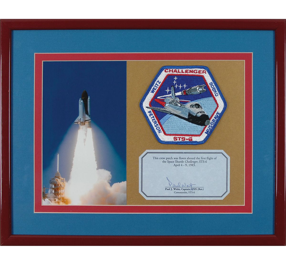 Flown embroidered STS-6 mission patch, 4.5? wide, carried on board the first flight of the Shuttle Challenger in April of 1983. Accompanied by a signed statement from Commander Paul Weitz stating, “This crew patch was flown aboard the first flight of the Space Shuttle Challenger, STS-6, April 4–9, 1983.” Patch and statement are double-matted and framed with a photo of liftoff to an overall size of 15 x 12. In fine condition.