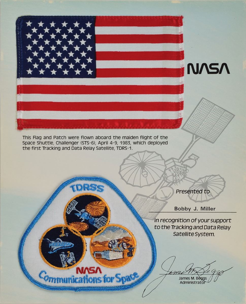 Flown 5.75 x 4 American flag and embroidered "TDRSS NASA Communications for Space" patch, 4.75 4.25, carried on board the maiden flight of the Space Shuttle Challenger during the STS–6 mission. Both are affixed to an 8.5 x 11 presentation certificate issued to Bobby J. Miller in recognition of his "support to the Tracking and Data Relay Satellite System." In fine condition, with some light scuffing to the edges of the sheet.