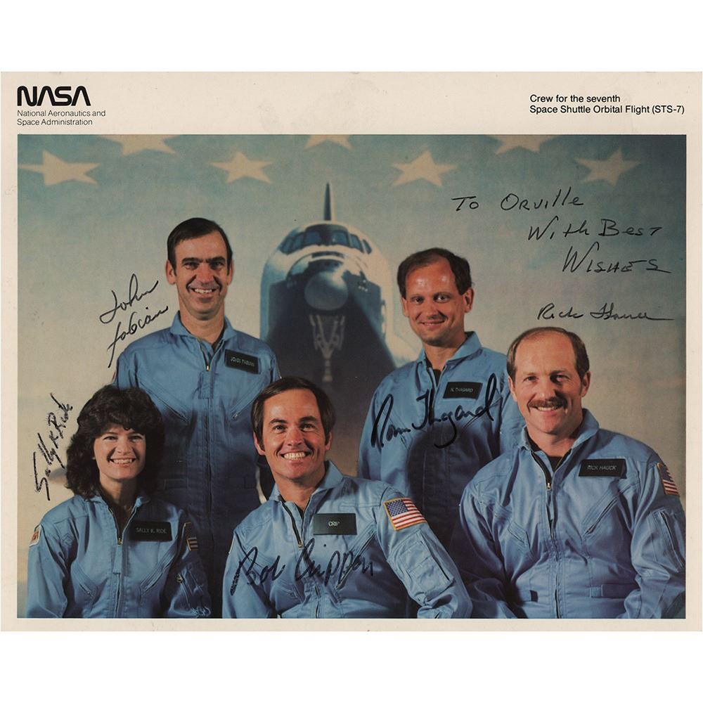 Official color 10 x 8 NASA lithograph of the STS-7 crew posing together in their blue flight suits, signed and inscribed in black felt tip, "To Orville, with best wishes, Rick Hauck," "Sally Ride," "Bob Crippen," "Norm Thagard," and "John Fabian." In fine condition.
