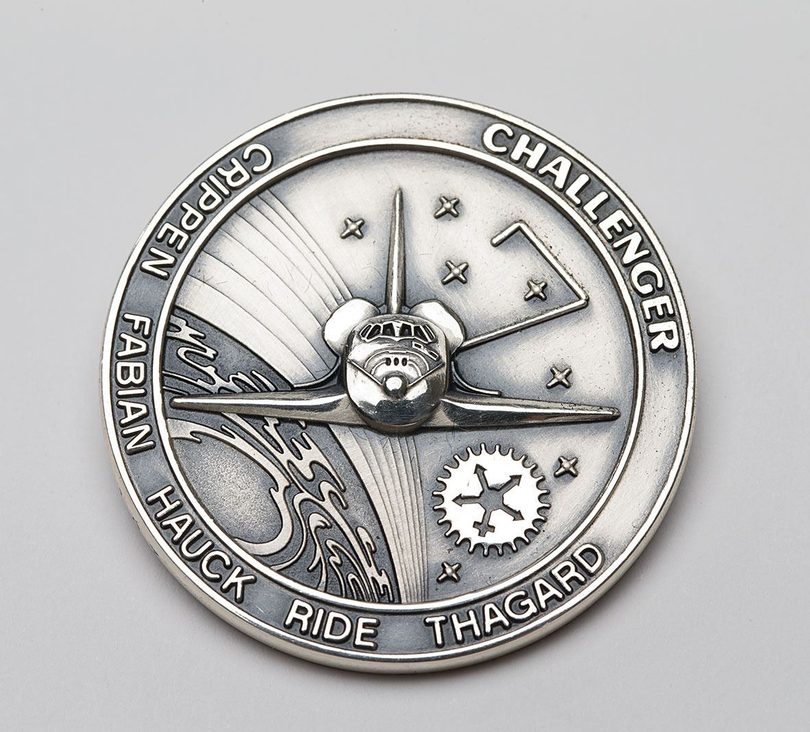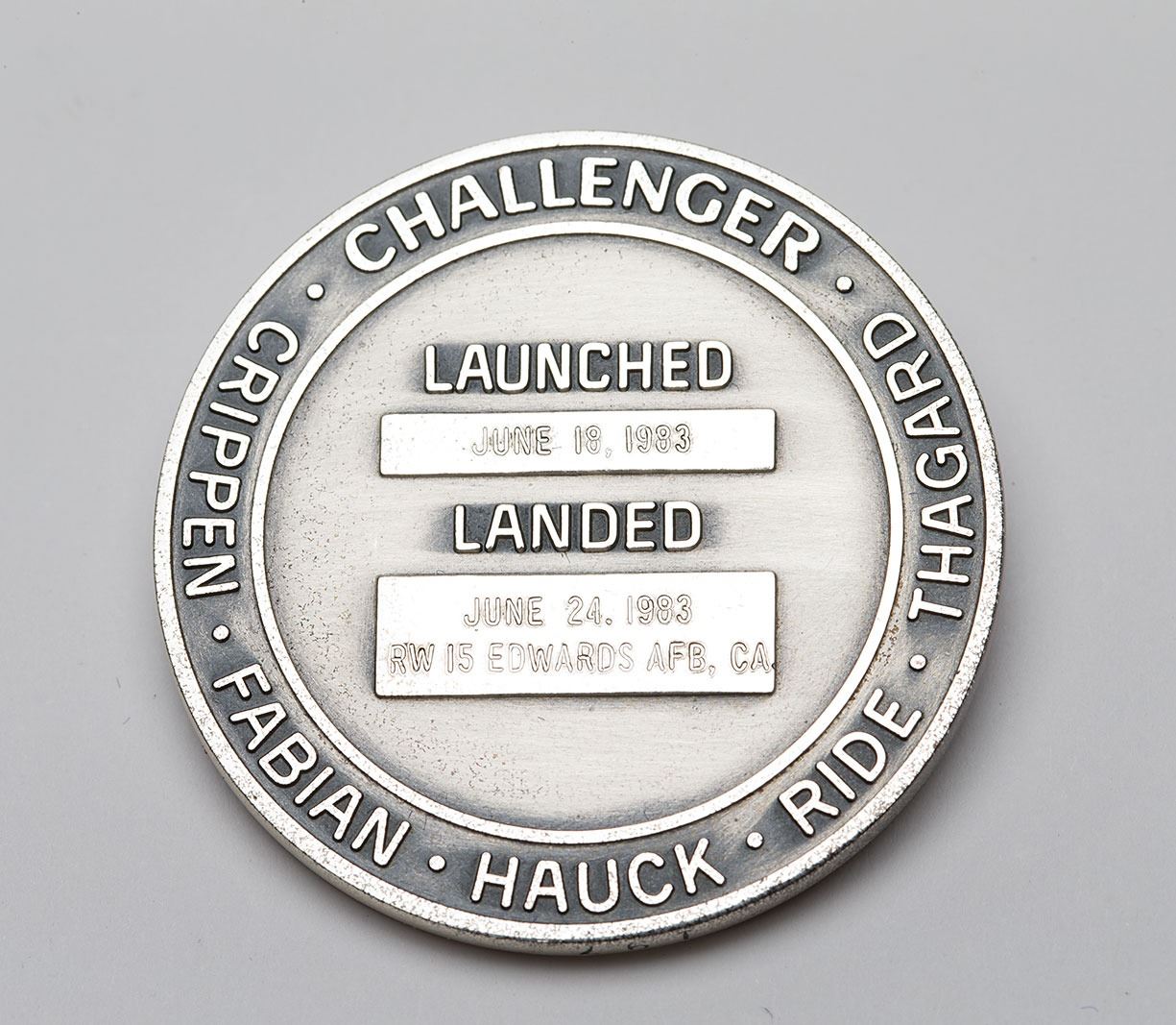 Unflown sterling silver STS-7 Robbins medal, approximately 1.5? in diameter, featuring a raised design of the mission insignia on the face. The reverse is engraved with the launch date, "June 18, 1983," and landing date and location, "June 24, 1983, RW 15 Edwards AFB, CA." The medal is serial numbered "197" and stamped with the Robbins hallmark on the edge. Condition is mint state. Accompanied by a small plastic box with stiff blue liner. From the collection of a former Robbins Company executive. STS-7 is especially noteworthy for carrying Sally Ride into space, making her America's first female astronaut.