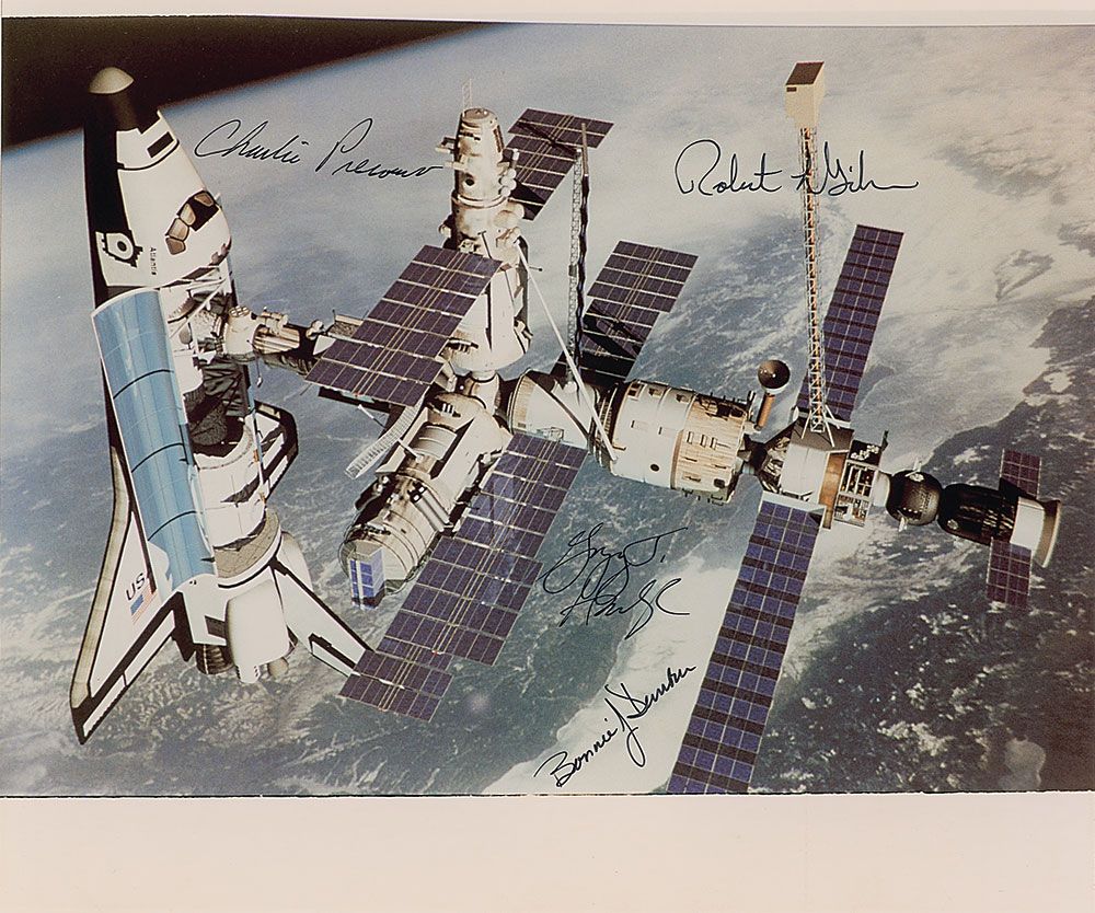 Color glossy 12 x 10 photo of the Space Shuttle Atlantis docking to Mir, signed in black felt tip by Robert L. Gibson, Charles J. Precourt, Bonnie J. Dunbar, and Gregory J. Harbaugh. In fine condition.