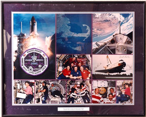 STS-73, 1995, FLOWN Crew Patch. Mounted on a framed, multicolor presentation board (20x16") that is faintly inscribed at top: "Charlie - Thanks for the great support of STS-73 - The crew of Columbia". The board is signed in various places by all the crew members. There is a descriptive label at the bottom that reads: "This patch was flown aboard the Space Shuttle "Columbia", STS-73, October 20 - November 5, 1995" Attractive.