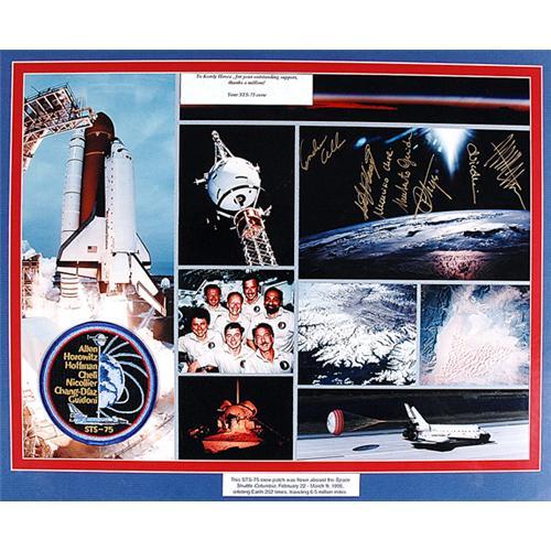 <Our item number 136926><B>STS-75, 1996, FLOWN Crew Patch.</B> Mounted on a multicolor presentation board (16x20") with a photo montage of the flight. The board has a printed label that reads: "To Kandy Hosea, for your outstanding support, thanks a million! Your STS-75 crew". A label at the bottom reads: "This STS-75 crew patch was flown aboard the Space Shuttle Columbia, February 22-March 9, 1996, orbiting Earth 252 times, traveling 6.5 million miles". The whole crew (Allen, Horowitz, Hoffman, Cheli, Nicollier, Chang-Diaz and Guidoni) have signed the montage in gold ink. Excellent overall condition and quite scarce. <BR>Estimated Value $250 - 350. <BR><BR>Our item number 136926<BR><IMAGES><P ALIGN="CENTER"><IMG SRC="http://www.goldbergcoins.net/liveauction/49jpegs/136926.jpg"> </P></IMAGES>