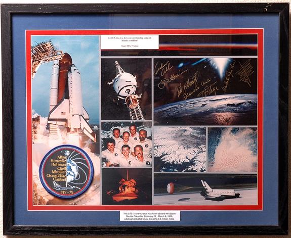 STS-75, 1996, FLOWN Crew Patch (4") mounted on a framed multicolor montage (21x17") that has been signed by the crew in gold ink. There is a descriptive label at the bottom that reads: "This STS-75 crew patch was flown aboard the Space Shuttle Columbia, February 22-March 9, 1996, orbiting Earth 252 times, travelling 6.5 million miles. Attractive.