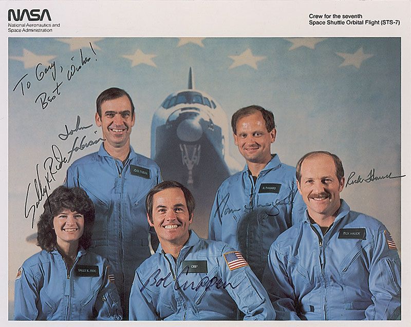 Color 10 x 8 NASA photo of the Challenger crew, signed and inscribed in black felt tip, “To Gary, Best wishes! Sally K. Ride,” ”Bob Crippen,” “John Fabian,” “Rick Hauck,” and “Norm Thagard.” In fine condition.