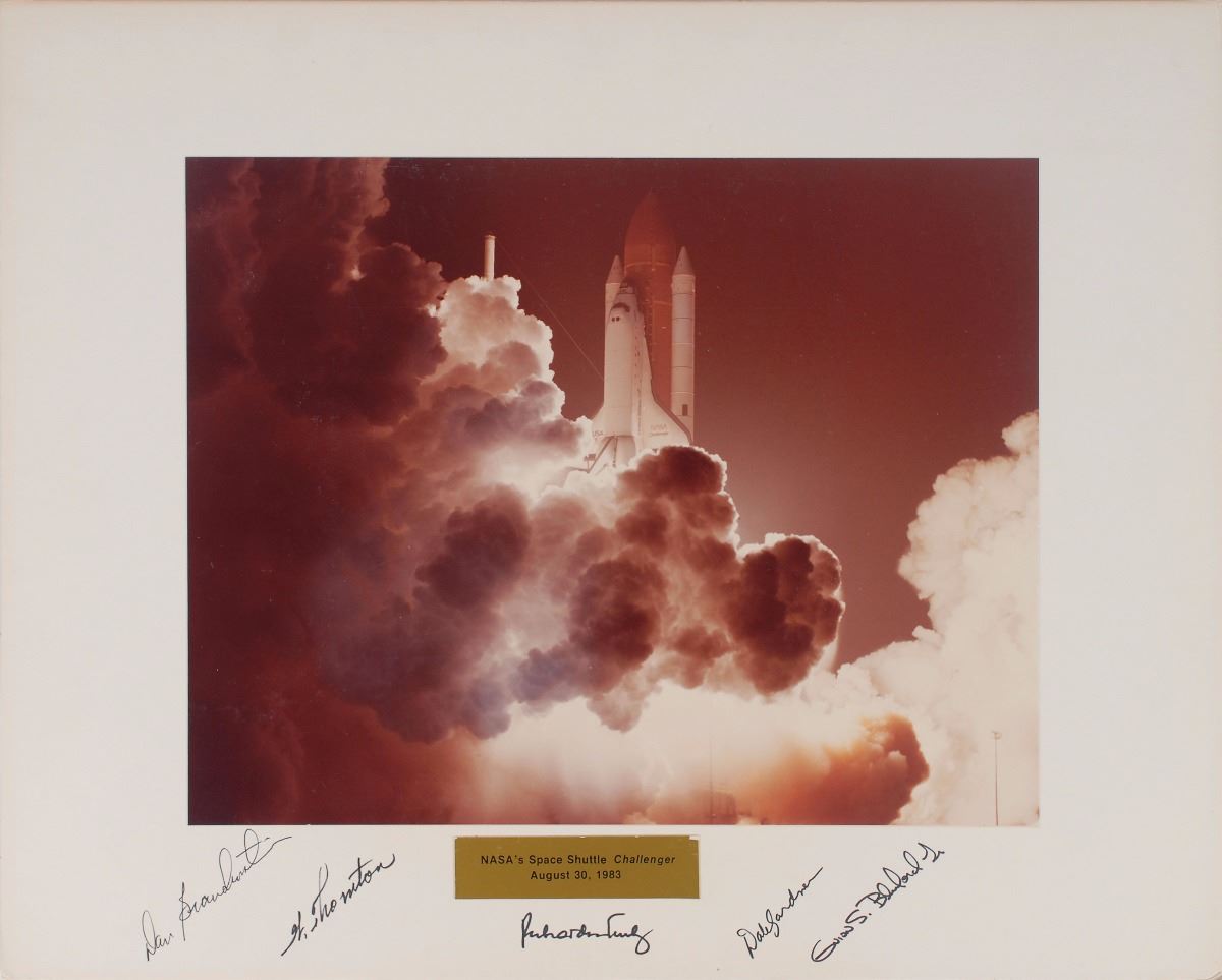 Color semi–glossy 14 x 11 photo of the launch of the STS–8 Challenger on August 30, 1983, affixed to its original mount, signed on the mount in black ink or felt tip by the five crew members: Dan Brandenstein, William Thornton, Richard Truly, Dale Gardner, and Guion S. Bluford, Jr. Mount bears an affixed nameplate. In fine condition. Accompanied by a NASA press release for the photo. From the collection of aerospace memorabilia specialist Ken Havekotte.