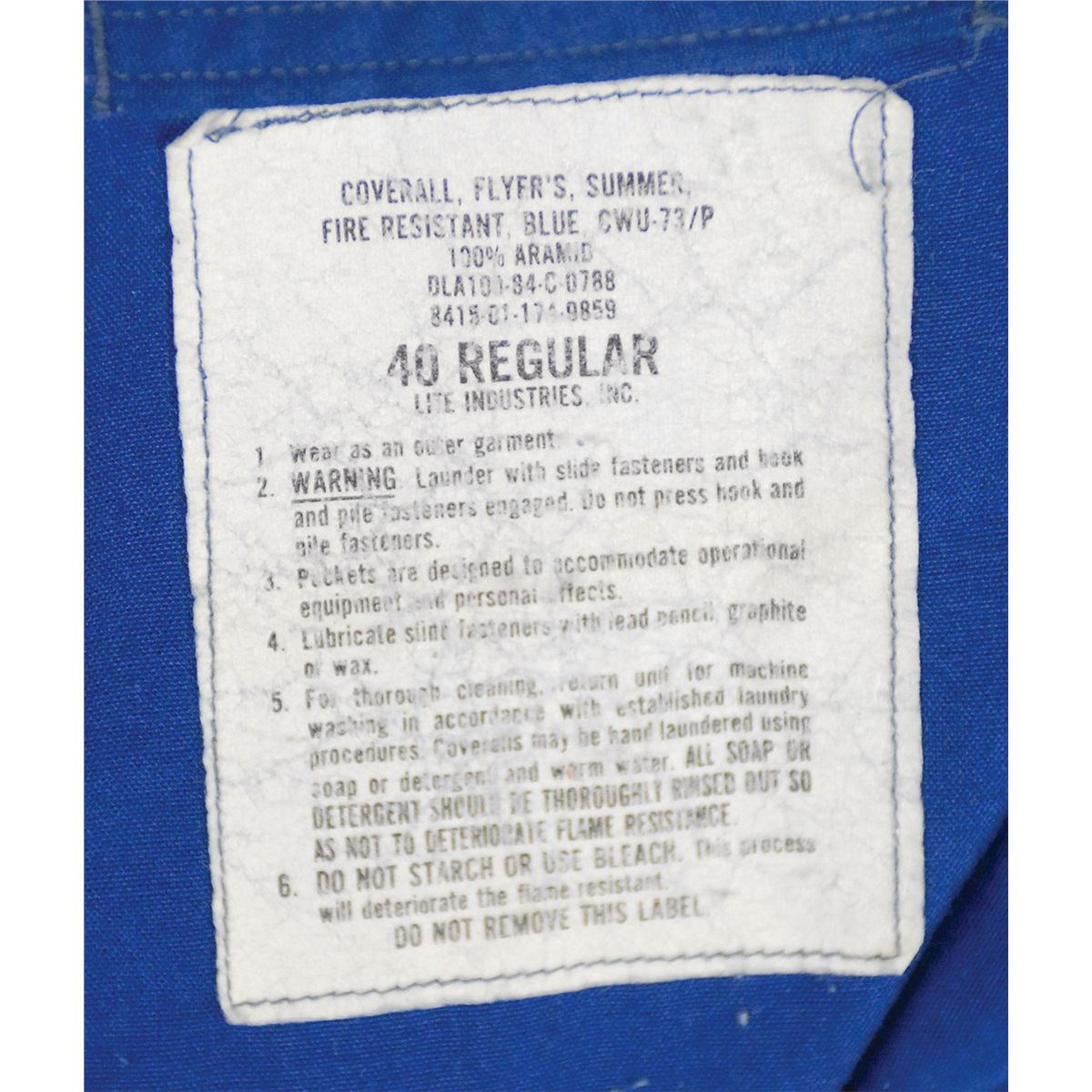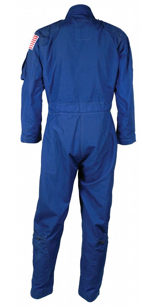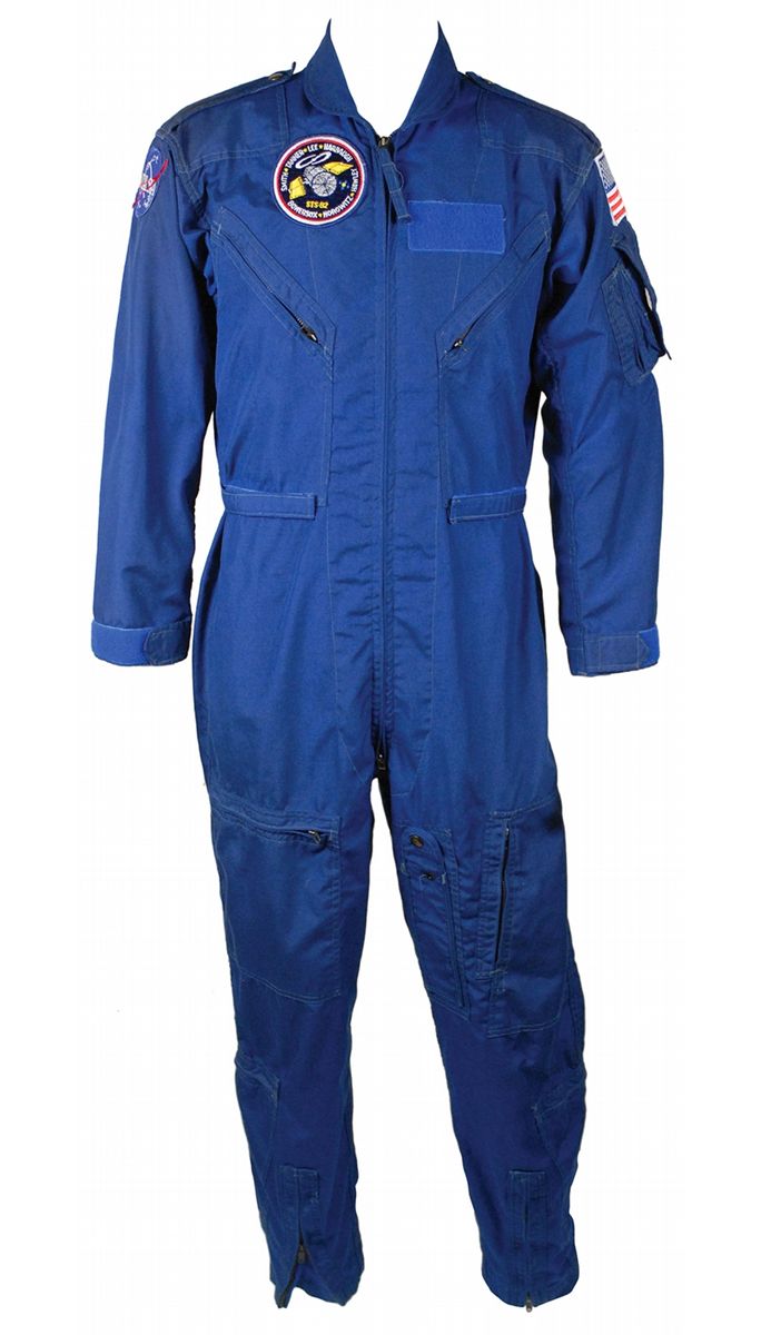 One-piece NASA flight suit for shuttle Discovery mission STS-82. Dark-blue one-piece suit retains its Life Industries label inside the collar which reads, “Coverall, Flyer’s, Summer, Fire Resistant, Blue CWU-73/P.” An embroidered mission patch is sewn onto the right breast, with an American flag and ‘meatball-style’ NASA logos sewn onto the shoulders. Garment features multiple zippered pockets, a zip-up front, and a Velcro swatch over left breast for a name tag. In fine condition.