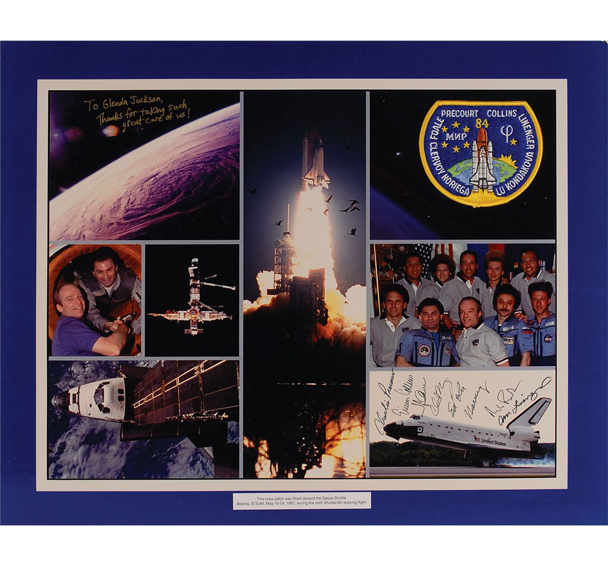 Color glossy 20 x 16 composite photo of the mission, signed in black felt tip by Charlie Precourt, Eileen Collins, Jean-Francois Clervoy, Carlos Noriega, Edward Lu, Yelena Kondakova, C. Michael Foale, and Jerry Linenger. A flown mission patch is affixed to the top of the photo, carried on the Atlantis from May 15–24, 1997. Photo is also inscribed in gold ink in an unknown hand, “To Glenda Jackson, Thanks for taking such great care of us!” Photo is affixed to an identical size board, with a small caption affixed to the bottom border. In fine condition, with some scattered light surface marks and dings.