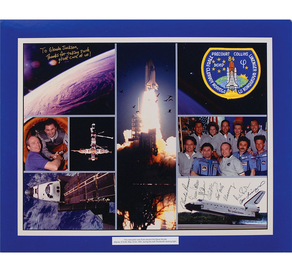 Flown embroidered Shuttle STS-84 mission patch, 4 x 3.5, carried on board the Atlantis during its May 1997 mission. Patch is affixed to a 20 x 16 color glossy composite photo of the shuttle and crew, with a typed caption affixed to the bottom, and inscribed in gold ink in an unknown hand, “To Glenda Jackson, Thanks for taking such great care of us!,” and signed in black felt tip by Charlie Precourt, Eileen Collins, Jean-Francois Clervoy, Carlos Noriega, Edward Lu, Yelena Kondakova, C. Michael Foale, and Jerry Linenger. In fine condition.