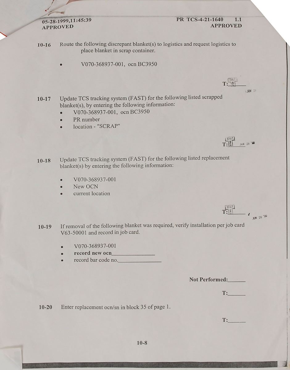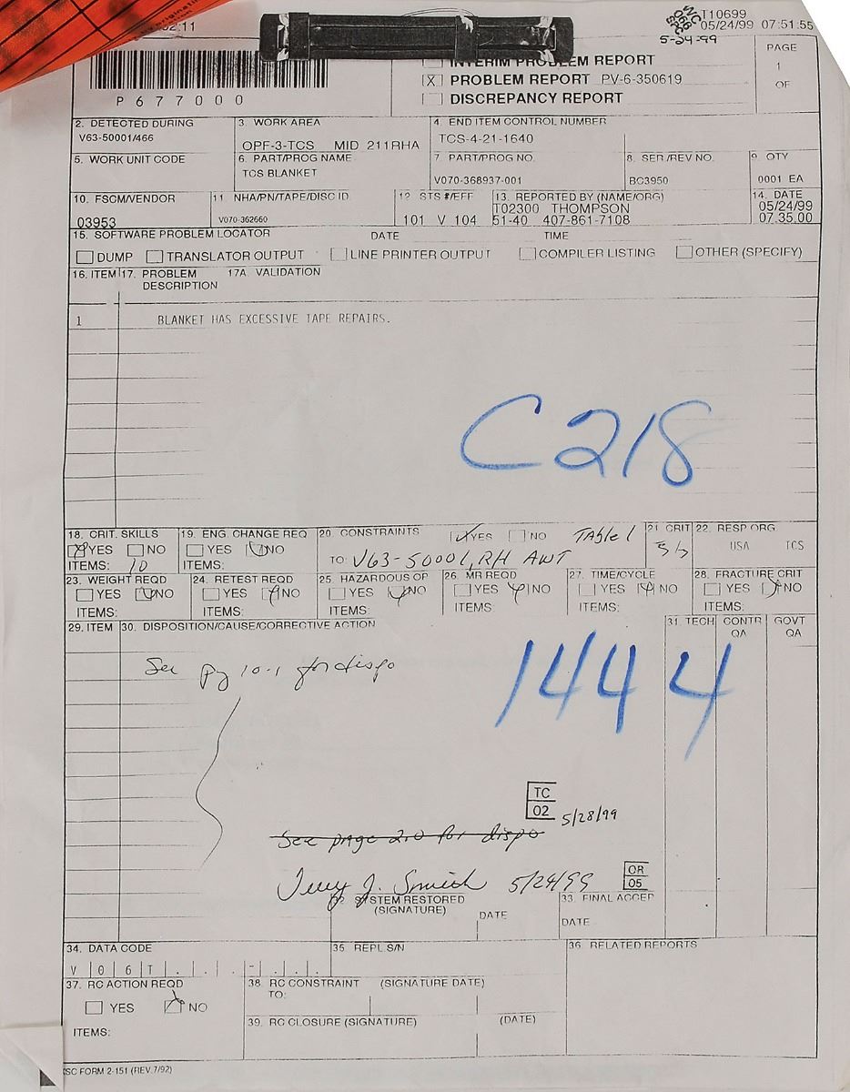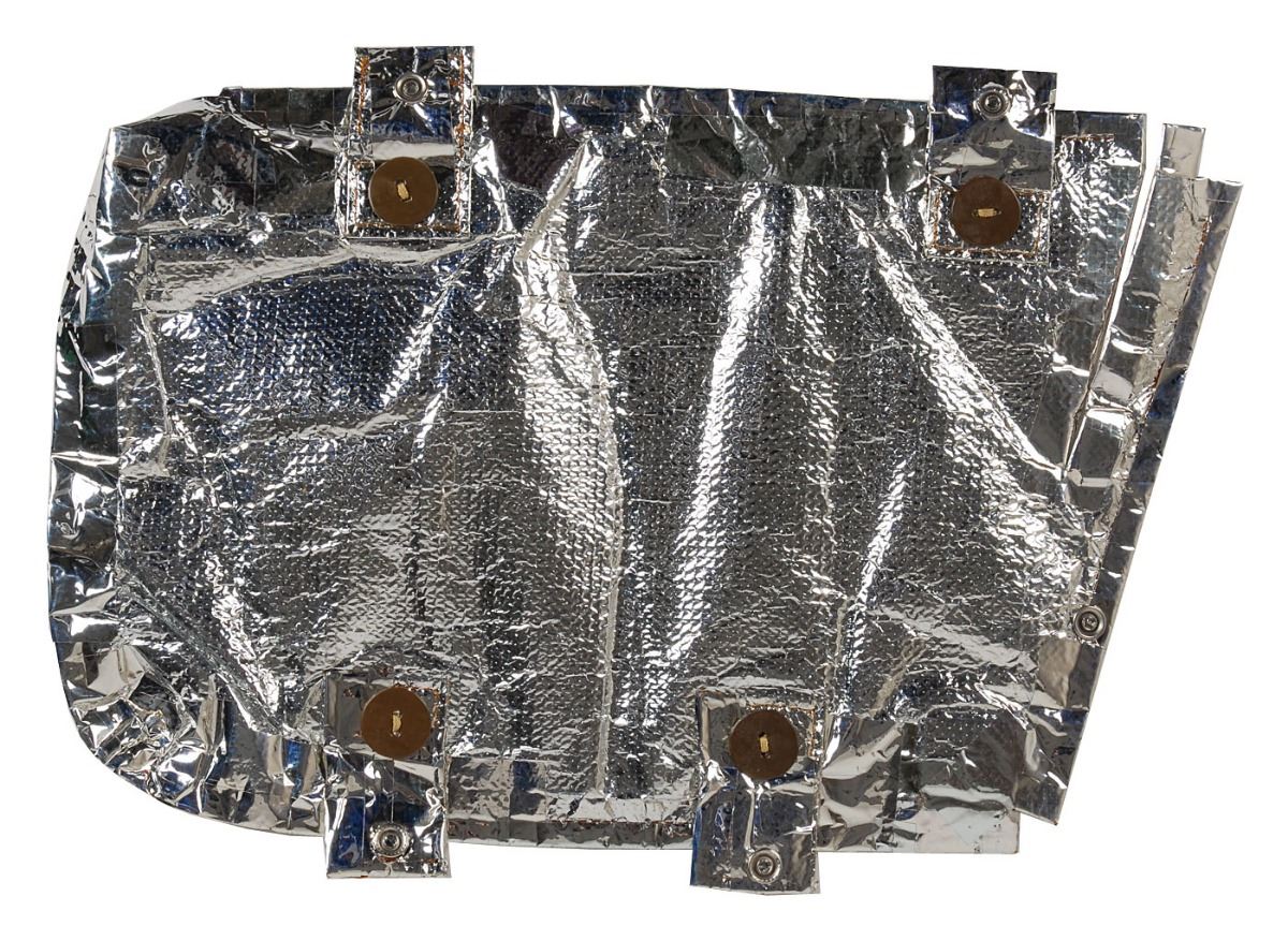 Available to US bidders only. Flown Multi-Layer Insulation (MLI) thermal blanket carried on the Space Shuttle Atlantis during STS-86, measuring 15 x 9.5, numbered V070-368937-001 and 03953-BC-3950. A KSC non-conforming material tag and additional paperwork are also included. In very good to fine condition. From the collection of aerospace memorabilia specialist Ken Havekotte.