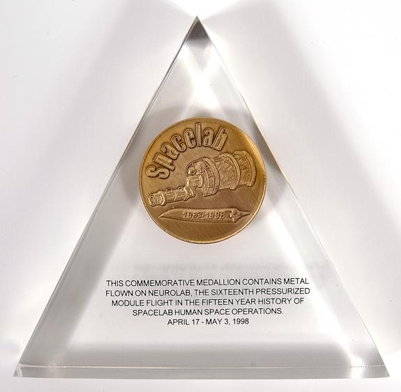 STS-90, 1998, FLOWN NASA "Spacelab" Medallion (1.5") This bronze NASA medallion is mounted in a clear, triangular desk display (4.5x1") on which is engraved: "This commemorative medallion contains metal flown on Nerulab, the sixteenth pressurized module flight in the fifteen year history of Spacelab human space operations. April 17-May 3, 1998". Pristine condition and attractive.