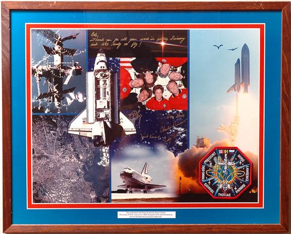 STS-91, 1998, FLOWN Crew Patch (4") mounted on a framed multicolor presentation certificate (21x17") that has been signed in gold by crew members Precourt, Gorie, Kavandi, Thomas and one other and inscribed: "Bob, Thank you for all your work in getting Discovery and AMS ready to fly. There is a descriptive label at the bottom of the frame that reads: "This crew patch was flown aboard the Space Shuttle Discovery, STS-91, June 2-12, 1998, during the ninth and final docking mission with the Russian space station MIR". A copy of the NASA letter listing the items flown in the Official Flight Kit on this flight is included. Only 250 crew patches are listed as having been carried. This is the first flown patch from this flight that we have seen.