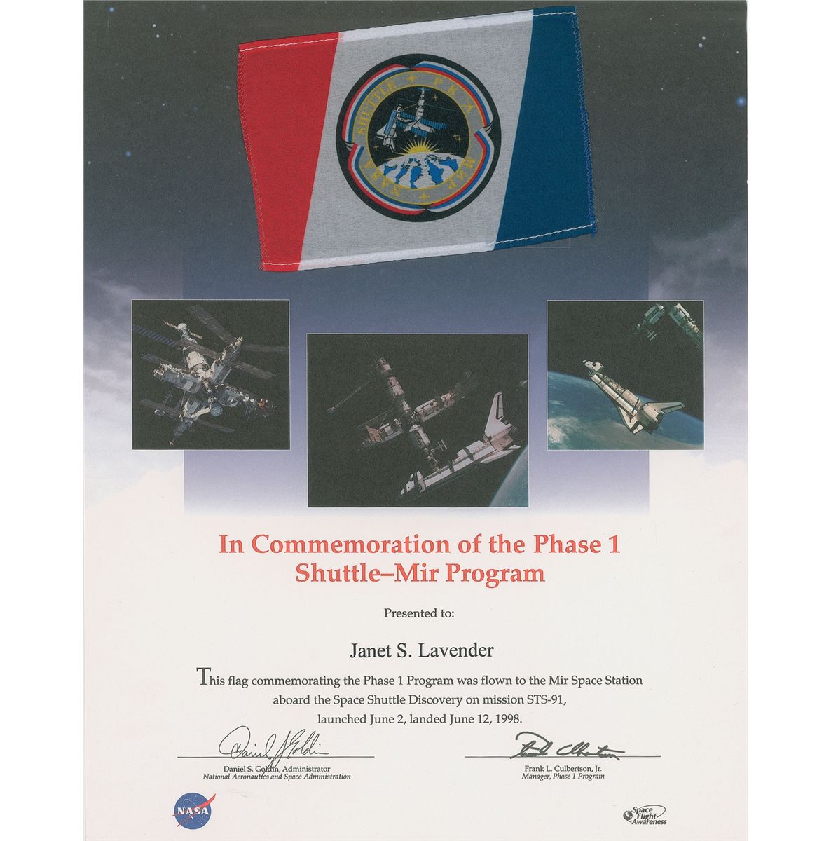 Printed fabric flag, 5.5 x 3.75, flown to the Mir space station on board the Space Shuttle Discovery on mission STS-91 in June of 1998. Flag is affixed to an 11 x 14 certificate presented to Janet S. Lavender in commemoration of the Phase 1 Shuttle-Mir program.