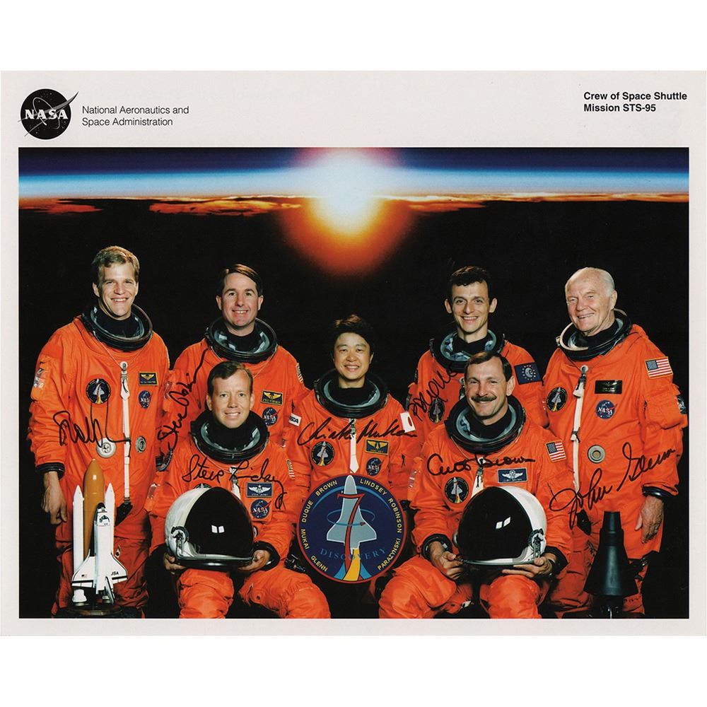 Uncommon color 10 x 8 NASA lithograph of the crew of STS-95, the historic return to space for Senator John Glenn, signed in black felt tip by John Glenn, Curt Brown, Stephen K. Robinson, Pedro Duque, Steve Lindsey, Scott Parazynski, and Chiaki Mukai. In very good condition, with overall creasing.