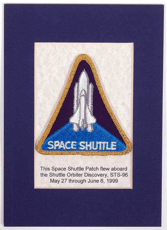 STS-96, 1999, FLOWN "Space Shuttle" Patch (3") mounted on a blue/white presentation card (5x7") that reads: "This Space Shuttle Patch flew aboard the Shuttle Orbiter Discovery, STS-96, May 27 through June 6, 1999". A copy of the "Official Flight Kit (OFK) inventory list is enclosed as a certificate of authenticity. The inventory list reads, in part: "It is our understanding these flown momentos will be used by payload customers and the Space Shuttle Program Office as special presentation items for deserving individuals who supported the mission". Attractive. Only 15 of these patches were flown on this flight.