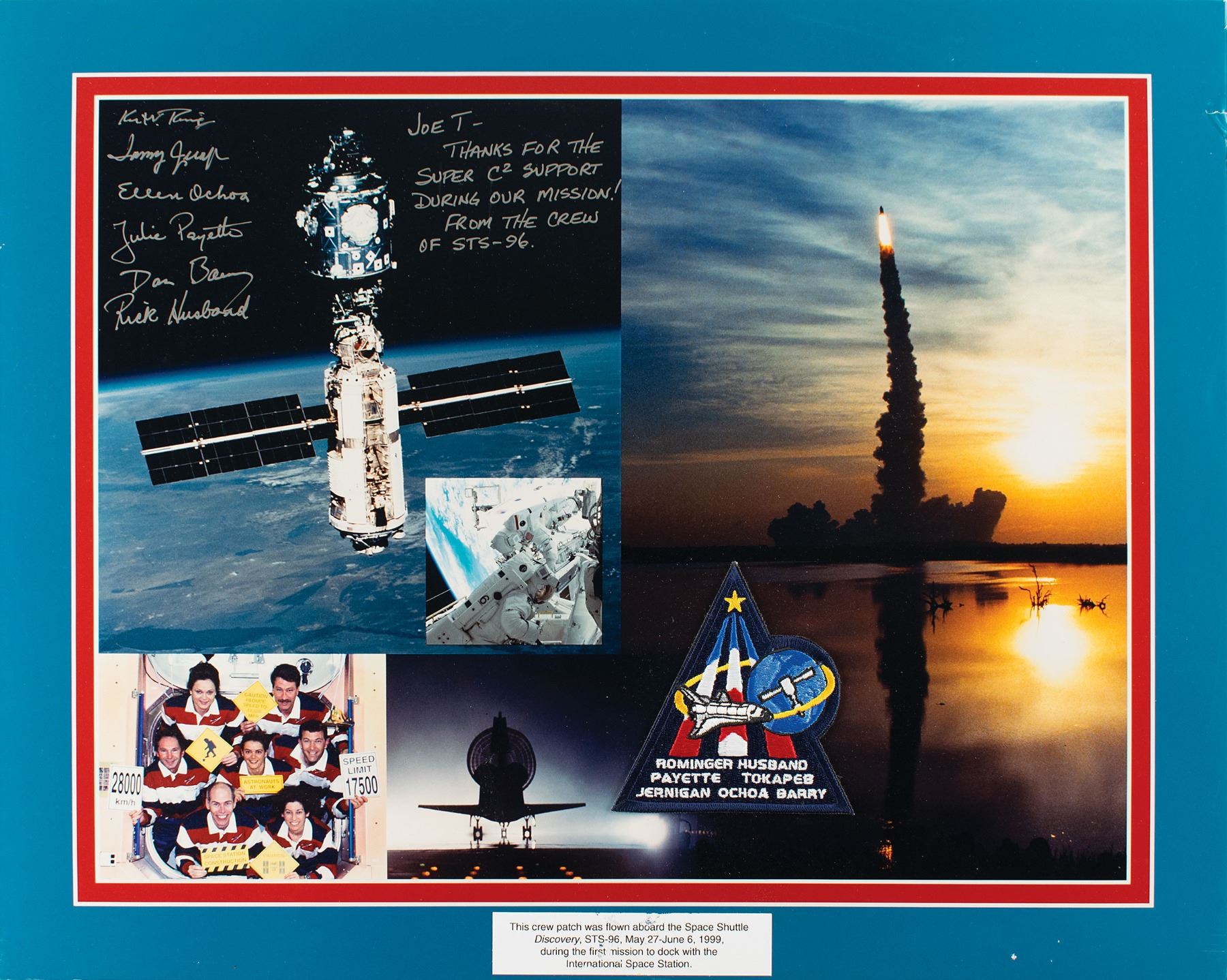 Color glossy 16 x 20 composite photo of the STS-96 crew and various images from their 9-day mission, featuring a flown embroidered mission patch affixed to lower portion, with the photo signed in silver ink by Kent Rominger, Rick Husband, Dan Barry, Ellen Ochoa, Tamara Jernigan, and Julie Payette, with an inscription reading: “Joe T—Thanks for the super C2 support during our mission! From the crew of STS-96.” The photo bears an affixed caption in the lower border, which reads: "This crew patch was flown aboard the Space Shuttle Discovery, STS-96, May 27–June 6, 1999, during the first mission to dock with the International Space Station.” Affixed to the original same-size mount. In fine condition, with a small crease to upper right corner. Accompanied by a signed certificate of authenticity from veteran Space Shuttle astronaut Joe Tanner.