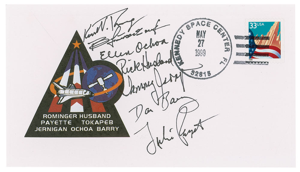 Commemorative cover with a cachet honoring the Discovery’s mission, bearing a launch date cancellation, signed on the front in black ink by all seven crew members: Kent Rominger, Rick Husband, Tamara Jernigan, Ellen Ochoa, Daniel Barry, Julie Payette, and Valery Tokarev. In very fine condition. This mission was first shuttle flight to dock with the International Space Station.
