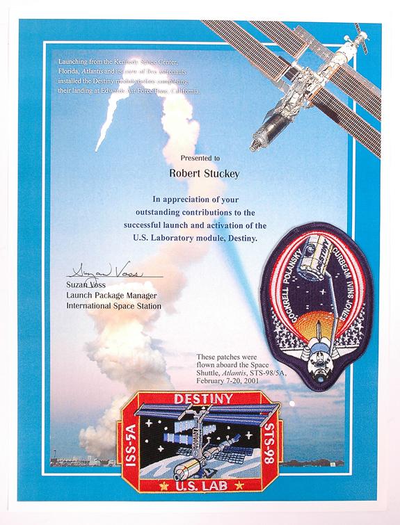 STS-98, 2001, FLOWN "Destiny" Module Mission Patch AND Crew Patch. 5x3") Both patches are mounted on a large, multicolor presentation certificate (11x14.5") that reads, in part: "These patches were flown aboard the Space Shuttle, Atlantis STS-98/(ISS)-5A, February 7-20, 2001. A copy of a NASA letter listing the contents of the Official Flight Kit (OFK) flown onboard this flight, is included. Only 100 flags and 100 patches are listed as having been flown. This is the first time we have seen this "Destiny" mission patch.