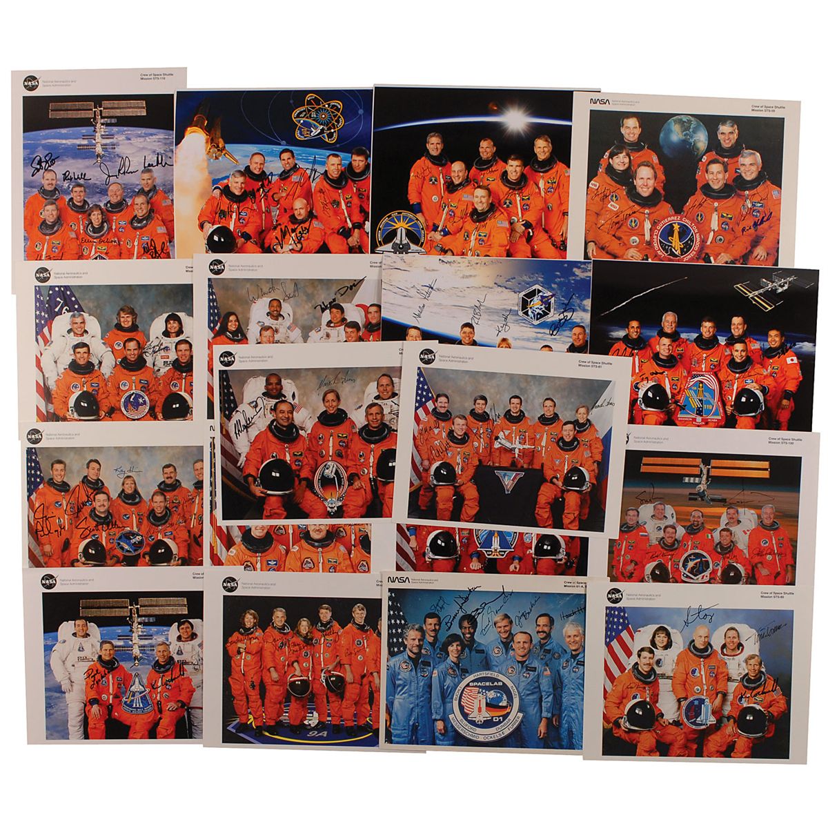 Collection of 18 color shuttle crew photos, various finishes, 8 x 10 and 10 x 8, with eight photos signed by the complete crew, and 10 signed by various crew members. Complete crews are: STS-132, 134, 110, 115, 48, 90, 119, and 130. Partial crew photos are: STS-100 (signed by five), 111 (signed by three), 112 (signed by five), 61-A (signed by six), 80 (signed by four), 81 (signed by four), 98 (signed by three), 59 (signed by five), 76 (signed by three), and 87 (signed by three). In fine overall condition.