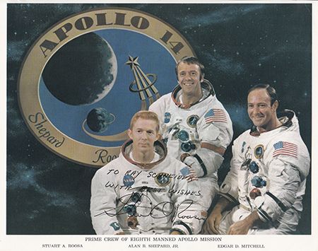 (1933 - 1994) American astronaut, command module pilot for the Apollo 14 mission. Rare I.S.P. 8" x 10" color, a NASA photo of the crew of Apollo 14, boldly inscribed and signed by Roosa in black ink. Near fine.