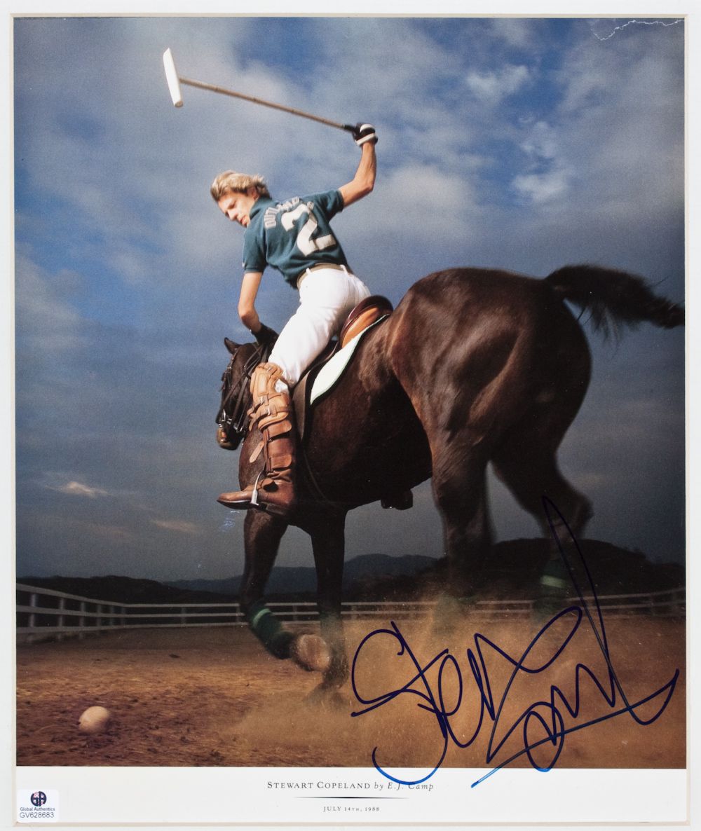 (b. 1952) Drummer for the influential rock band The Police, considered by some one of the greatest of all time. S.P. 10" x 12" color, shows Copeland astride one of his polo horses mid-swing in 1988, boldly signed at lower right corner in blue marker. Matted and ready to frame. Accompanied by a COA by Steve Sipe from Global Authentics. A ding to top right corner, otherwise very good.