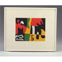 STUART DAVIS (1894-1964) screenprint on Mohawk Superfine, 1964, from the "Ten Works by Ten Painters" series, total edition of 550, for the Wadsworth Atheneum Museum of Hartford, CT, of abstract shapes and calligraphic writing in green, yellow, red and black, framed. Unsigned. Image: 11" x 14" $600 - 800