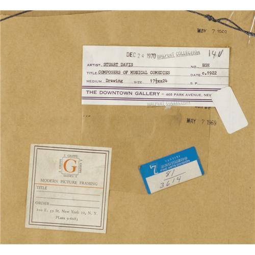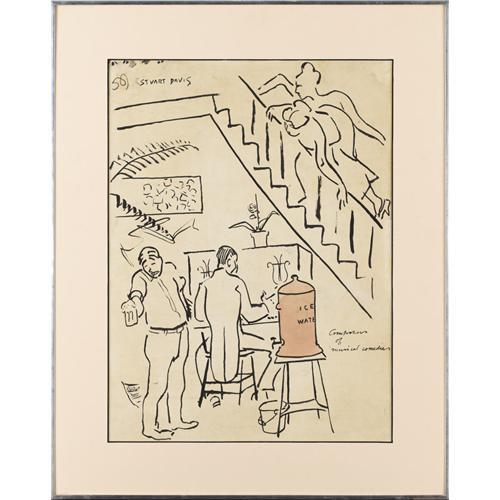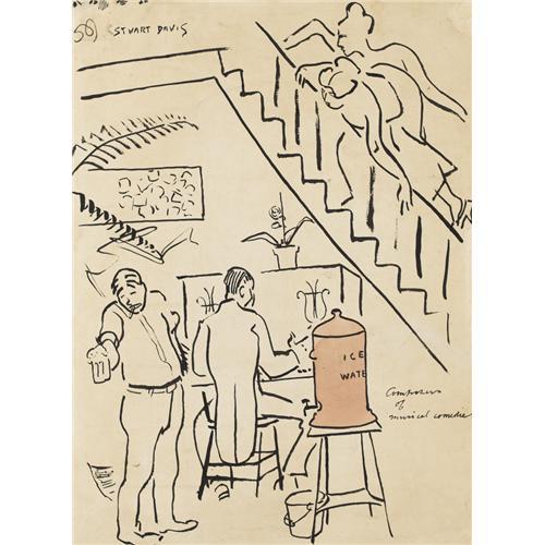 <B>STUART DAVIS</B></I> (American 1894-1964)<BR><I>Composers of Musical Comedies,</B></I> circa 1922<BR>India ink and brush with red ink wash on paper<BR>23 x 17-1/4 inches (58.4 x 43.8 cm)<BR>Signed upper left: <I>STUART DAVIS</B></I><BR>Titled lower right: <I>Composers of Musical Comedies</B></I><BR><BR>Provenance:<BR>The Downtown Gallery (New York);<BR>Sale, Sotheby Parke-Bernet (No. 3520), May 16, 1973, Lot 21;<BR>The Edith Gregor Halpert Collection;<BR>Property from a Private New York Estate<BR><BR>Exhibition:<BR>New York, The Downtown Gallery, American Drawings, 1964<BR><BR>Literature:<BR>Ani Boyajian and Mark Rutkoski, <I>Stuart Davis: A Catalogue Raisonné,</B></I> October 2007 (Illustrated)<BR><BR><BR><BR><b>Shipping:</b> Requires 3rd Party Shipping (<a target="_blank" href="http://www.heritageauctions.com/common/shipping.php">view shipping information</a>)