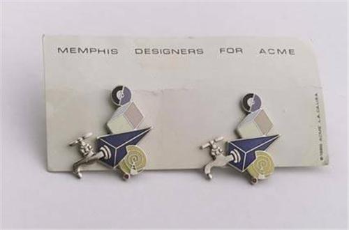 Paar Ohrringe,<BR> Metall, mehrfarbiges Email. Geometrische und gegenständliche Formen. L.: 2,5 cm. Bez.: ACME LOS ANGELES. Originale Verpackung. 1986<BR>