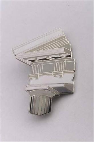 Brosche,<BR> Metall, mehrfarbig graues Email. Architektonische Formen. L.: 5 cm.Bez.: ACME LOS ANGELES. Originale Verpackung. Um 1985<BR>