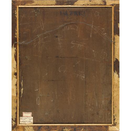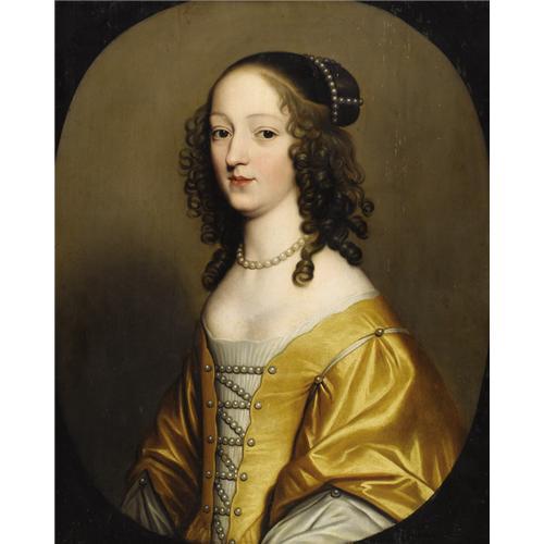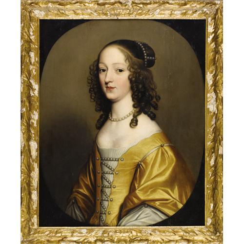 <B>Studio of GERRIT VAN HONTHORST</B></I> (Dutch 1590-1656)<BR><I>Portrait of Elizabeth Stuart, Queen of Bohemia</B></I><BR>Oil on panel, in painted oval<BR>28-1/2 x 22-3/4 inches (72.3 x 57.7 cm)<BR>Inscribed on the reverse on a paper label: <I>Antique oil painting of "Queen Elizabeth of Bohemia" cir. 1650 (sale no. 5135) / $485.00 / Miss Bessie Heard / Bought from Henry Stern / 329 Royal Street New Orleans, La. / April 25, 1956</B></I><BR><BR>Provenance:<BR>Henry Stern (New Orleans, Louisiana);<BR>Bessie Heard (McKinney, Texas);<BR>Bessie Heard Trust<BR><BR> <B>Condition Report:</B> Normal signs of wear as appropriate with age, minor flaking to the background and some scattered strenthening throughout<BR><BR><b>Shipping:</b> Requires 3rd Party Shipping (<a target="_blank" href="http://www.heritageauctions.com/common/shipping.php">view shipping information</a>)