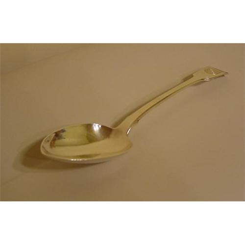 A wonderful English Sterling Silver Stuuffing Spoon measuring 11 7/8" in length. Mark dates it to 1830 and identifies the maker as A.B.SAVORY. In addition to the marks on the bottom of the handle there is a wonderful coat of arms on the other side of the handle. Excellent Condition with No Wear.