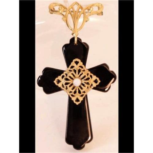 This is quite the elegant piece with a genuine opal center and larger onyx cross that hangs from an edwardian chatelaine watch brooch. The brooch has a really unusual locking clasp and is probably gold filled. The cross is so fabulous hanging from this because the black just enriches the golden color. The ornate filigree ornament in the center of this large cross is the nicest finishing touch! The length of both pieces together is 2 7/8" and it is 1 1/2" wide. Not sure if they are original to each other but they are in great condition and just so beautiful!!
