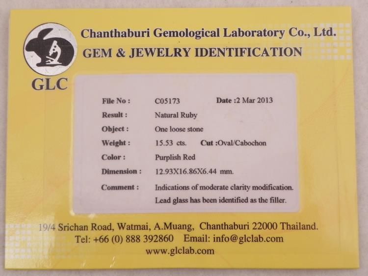 STUNNING 15.53 CT CERTIFIED RED RUBY HUGE CABOCHON CUT INCLUDED TREATED TO ENHACE COLOR CELLOPHANE WRAP MAY AFFECT PICTURE